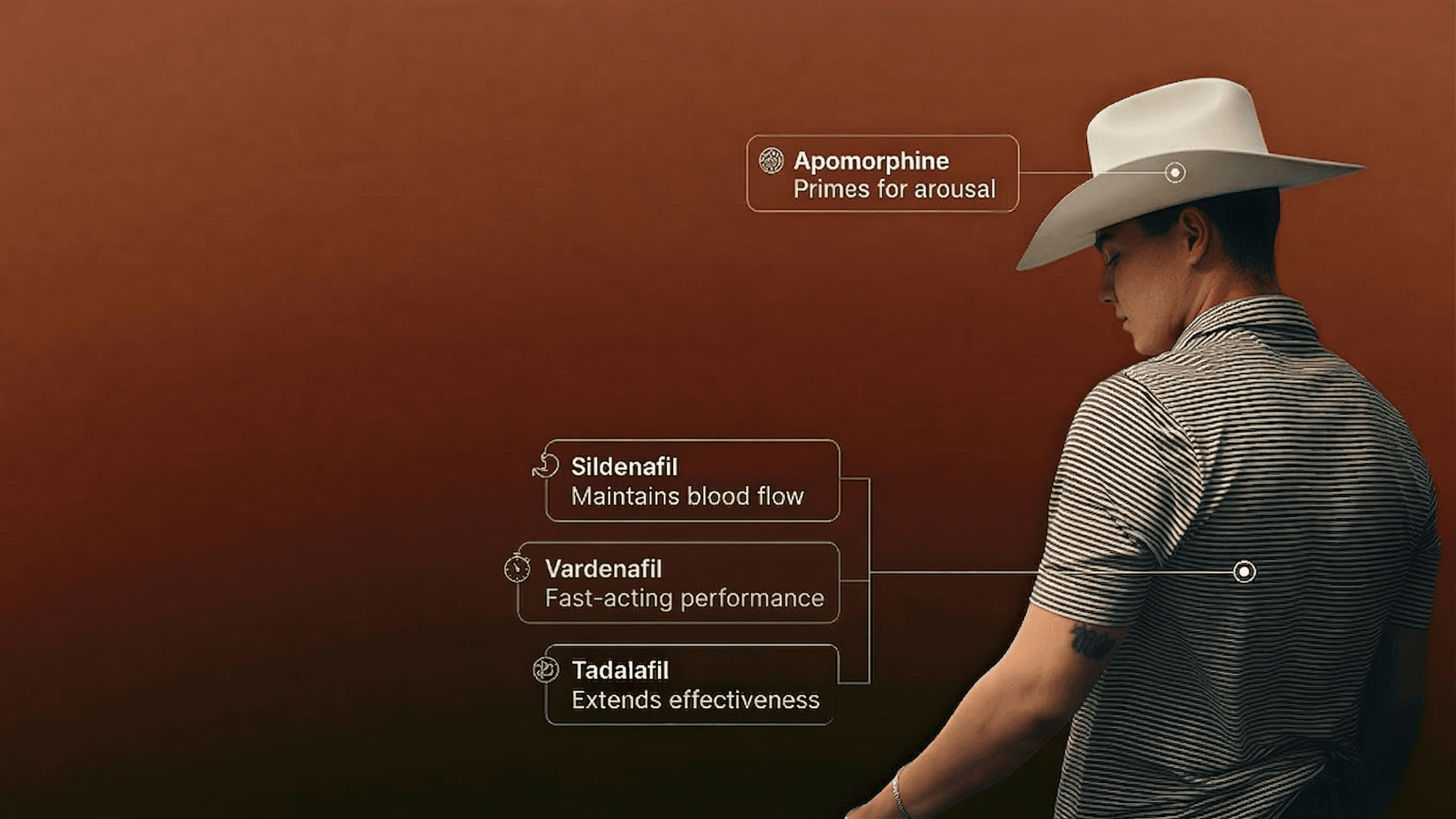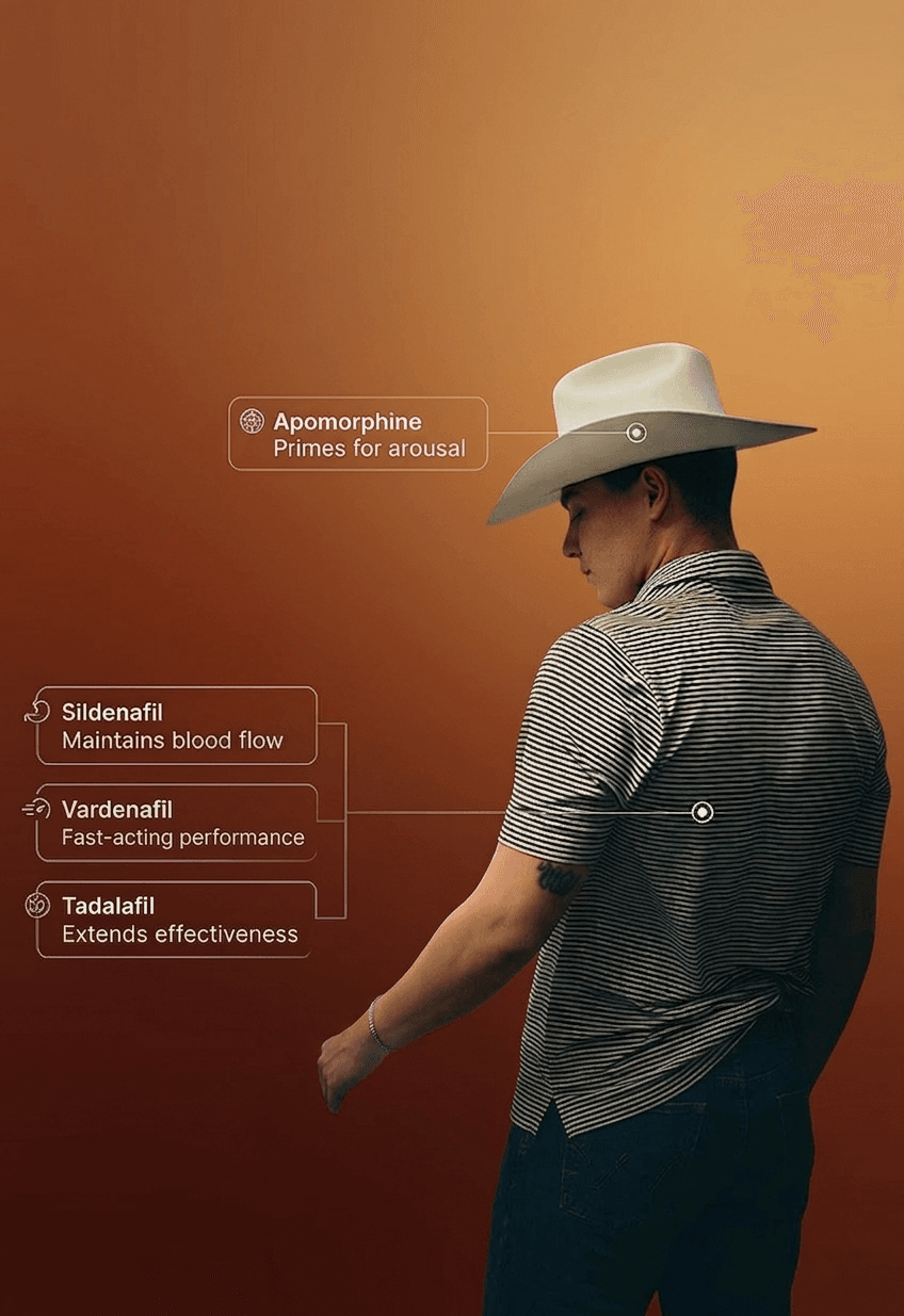 RODEO combines both sildenafil and tadalafil, which are short and long acting PDE5 inhibitors. It also includes a third ingredient, apomorphine. Because the medication dissolves under the tongue, it increases absorption directly into the bloodstream, making it work faster.